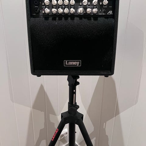 Laney A1+ akustisk gitar og vokalforsterker. Den yter 80 watt og har 2 kanaler med både XLR og jack innganger. Pent brukt og helt i orden. Dette er kvalitets forsterkere og de veier 13 kg pr stk. Disse har feste under for å settes på stativ hvis ønskelig. Jeg har 2 slike forsterkere og prisen er pr. stk.