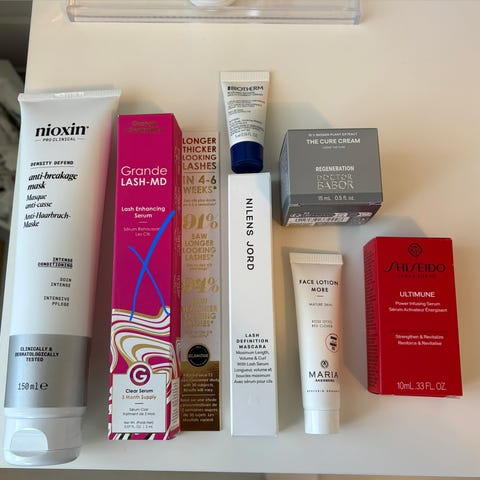 En boks med masse diverse hud- og hårpleie, kremer, sminke, neglelakkfjerner, parfymer, peel of-masker, selvbruning osv selges samlet.