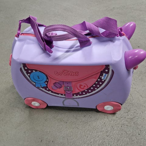 Solid og smart reisekoffert barnet kan sitte på eller bli dratt i bånd. Båndet mangler, men du kan bruke noe annet å dra ned, f eks. belte. Går som håndbagasje, og kan derfor brukes på flyplassen helt frem til ombordstigning. Brukt lite, som ny.