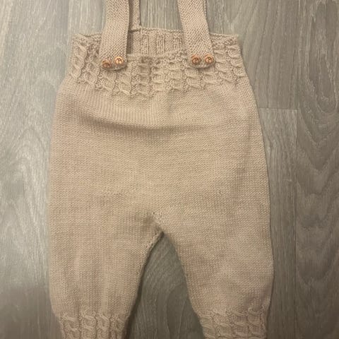 Pent strikka sett til barn. Str 80. Ble dessverre ikke brukt av oss grunnet passelig på feil sesong. Sommersett med shorts og topp, bølgemønster. Farge: Offwhite. Tror det er merinoull.