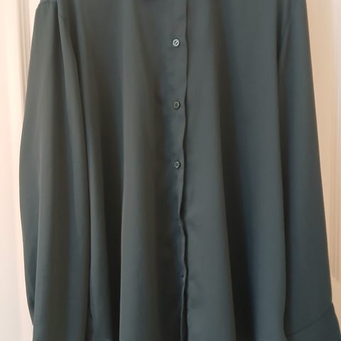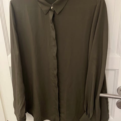 Selger en elegant og tidløs bluse fra H&M i størrelse XL. Blusen er i en delikat lysegrønn farge med lett glans, og har en løs og behagelig passform. Den passer perfekt både til hverdags og jobb, og kan styles både opp og ned etter anledning. Klassisk krage, knappelukking foran og et lett, luftig materiale gir et stilrent uttrykk.