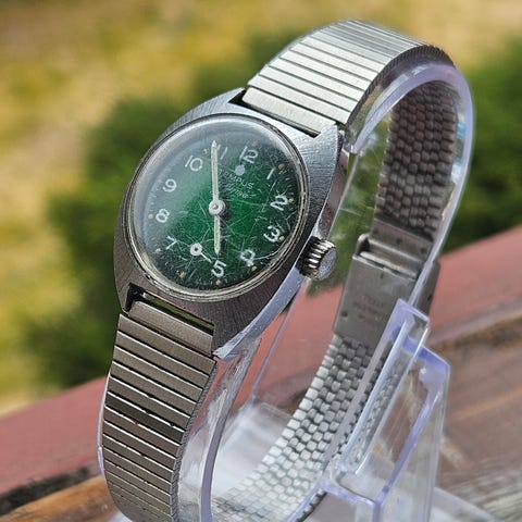 Vintage mekanisk Yema med rød skive og fleksibel lenke. En klassisk, franskprodusert dameklokke med kvalitetsverk.