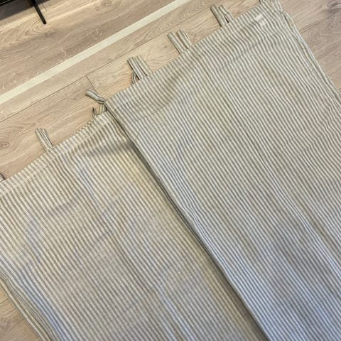 100% Polyester, lin-imitert. Elegant denimblå/gråblå/lyseblå/turkis farge, som ikke lenger tilgjengelig i butikk. Lett gjennomsiktige og slipper inn lys samtidig som de gir et lunt uttrykk til rommet. Pent og lite brukt, fremstår som nye. Selges pga plassmangel.
