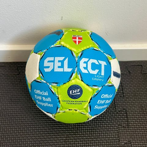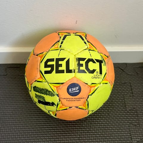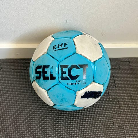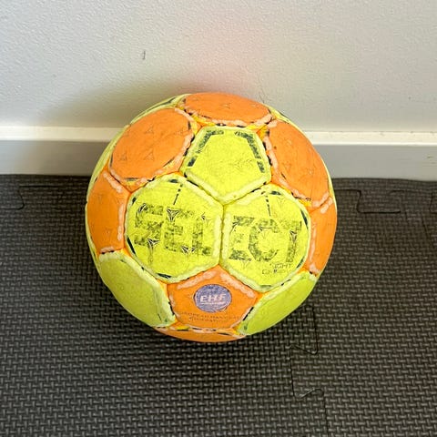 Pent brukt håndball. Navn skrevet med sprittusj på ballen.