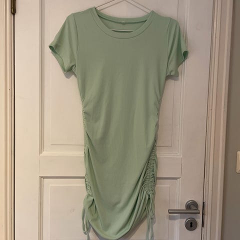 Blå lang kjole til kneet, har liten flekk på den. Har elastisk materiale i seg ☺️