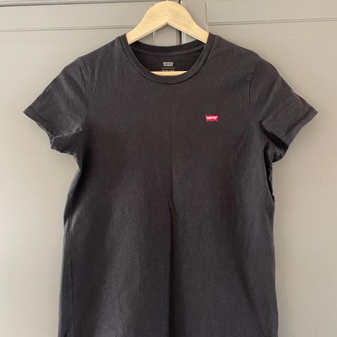 Pent brukt sort ribbet tskjorte fra Levi`s i bomull og størrelse M. Nypris er rundt 400kr, så selges for halv pris. Den kan sendes med Posten eller hentes på St. Hanshaugen.