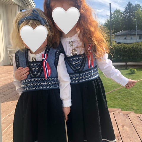 Verdens fineste bunad fra peanuts er blitt for liten! Str 92 men god på lengden! Siste bilde viser frøkna med bunad på og 110 cm høy. Trykknapper på forkle👌🏻