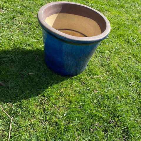 Passer fint ute, solid, støpt materiale. 38,5 cm. diameter og 35 cm høy. Den er i fin stand, god som ny.