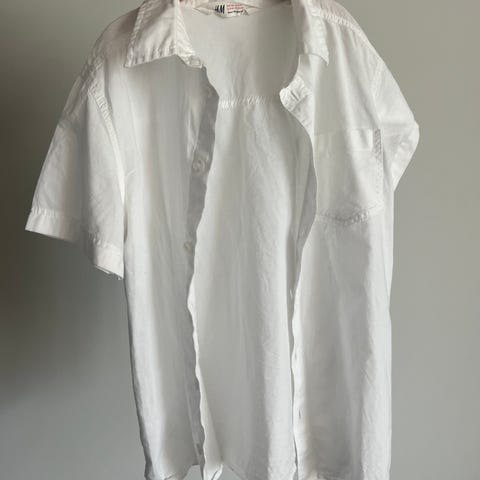 Skjorten ser helt ubrukt ut forfra, men har en skade nederst bak (som kan skjules oppi en bukse), se bilde.