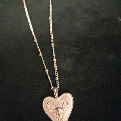Halskjedet er sølvfarget men jeg er usikker på hvilket materiale som er brukt.