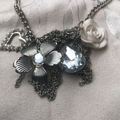 Nydelig smykke i sølvfarget materiale og lilla perle/plastaktig pyntet.