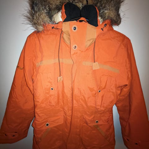 Jakke: Str S. Usymmetrisk glidelås og fargeskifter. Snølås, lomme til heiskort og god hette.