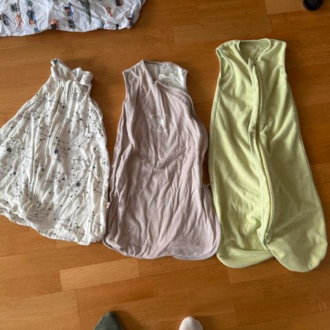 Tynnere stoff på rygg og litt tykkere forran over magen. Knapper på hver skulder og glidelås rund hele fotenden. Ingen synlig flekker.