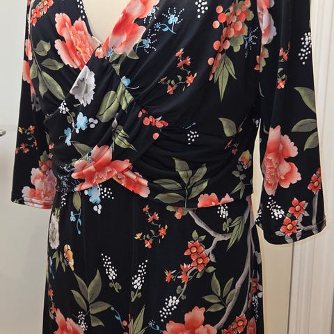 Pen kjole fra FAS. Størrelse ca 38 (T4). Pent brukt. Polyester. Elastisk. Ikke foret. Lengde fra overkant skulder til skjørtekant ca 99 cm. Omkrets under armer ca 100 cm, liv ca 90 cm. Billigste porto. Se også mine øvrige annonser (trykk på min profil for å se annonsene).