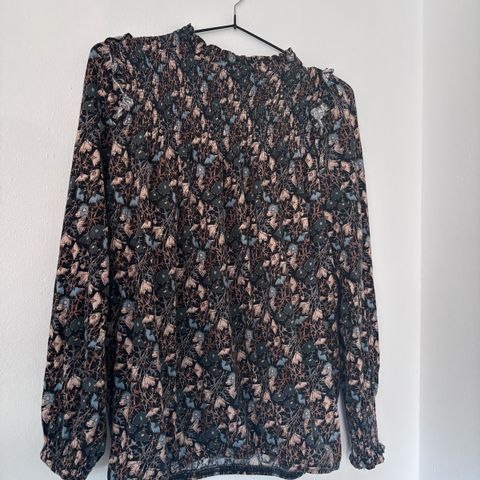 Bluse med nydelig mønster, florlett stoff og gull-farget knapper i nakken på halskanten og på mansjetten på armene. Litt blankt stoff. 100 % polyester. Brukt en gang.