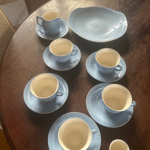 Kun igjen Grønn Grete kakefat / brødfat (24 x 27 cm.) bud over kr. 300.-. Grønn stor Sissel tekanne og kaffekuverter er solgt! Alle delene er i god stand (se bilder). Hentes i Tønsberg eller pakkes godt i bobleplast og sendes for kr. 70,- inkl. sporing og forsikring