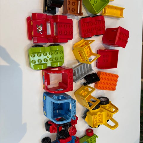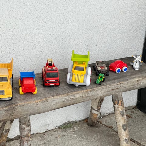 Gode solide biler i plast m/ myke gummihjul. Kan brukes både inne og ute