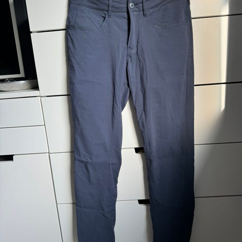 Houdini Thrill Twill Pants er chinos i blå farge for herre, størrelse S. Buksen har glidelåslommer og er laget i slitesterkt materiale egnet for ulike aktiviteter. Pent brukt.