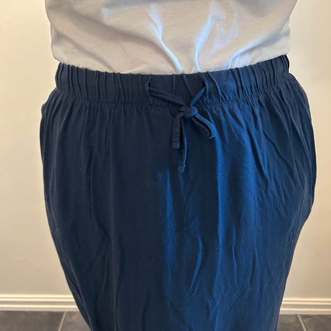 Helt nytt langt skjørt i str 42. Strikk i livet m snøring. Mørk blått.