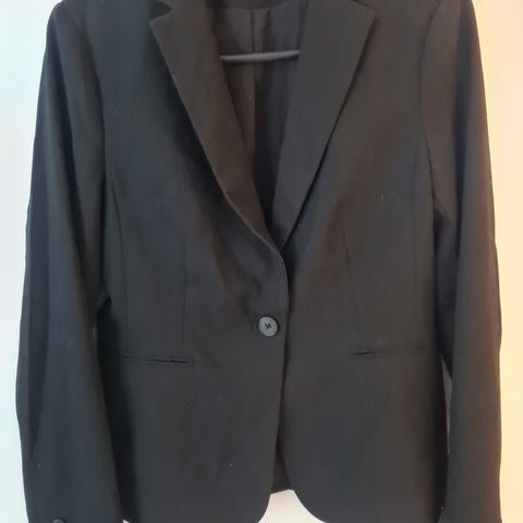 Blazer i blå farge, designet for kvinner i størrelse 42. Jakken har en knapp foran og lommer på siden. Materiale og merke er ikke oppgitt.