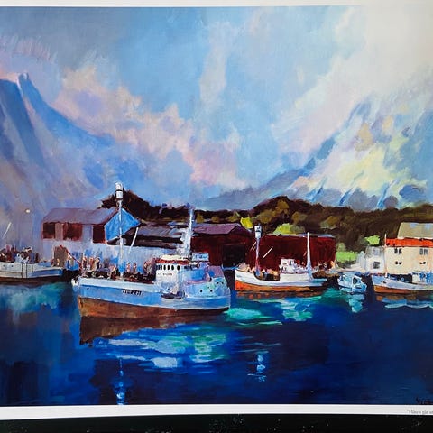 Litografiet «Couché de soleil breton» av den franske kunstneren Stéphane Lauro (født 1964). Arkformat: Høyde 38 cm, bredde 55,5 cm. Motivmål: Høyde 25 cm, bredde 42 cm. Nummerert og signert.
