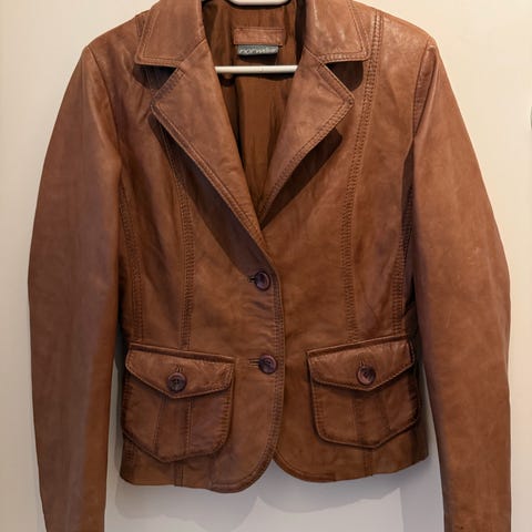 Selger en vintage blazer i ekte skinn fra HM. Jakken er trolig fra 60-/70-tallet, og den er i veldig bra stand for alderen. Den har noen flekker/bruksmerker som vises på bildene og fargen er mest lik på første bilde og bildet med mål på armen - rødbrun.