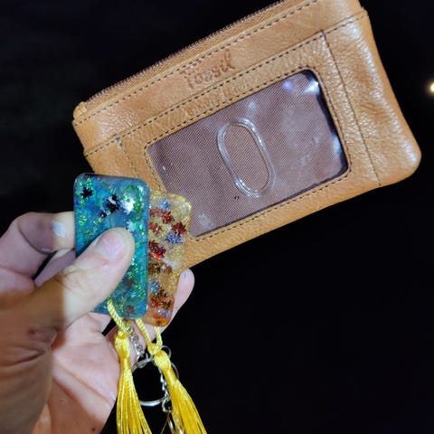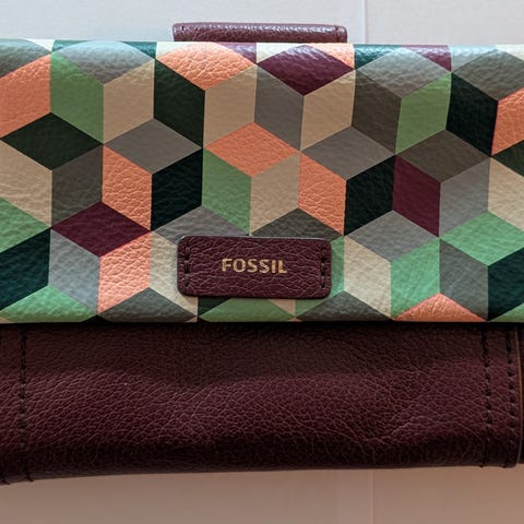 Vesken er romslig, er foret inni, hatter lommer inni. En av de har glidelås. Det er en utvendig lomme uten glidelås. Vesken og lommeboken er i skinn. Rundt glidelåsen på vesken er det kraftig stoff. For inni vesken og innvendig i lommeboken er det stoff.