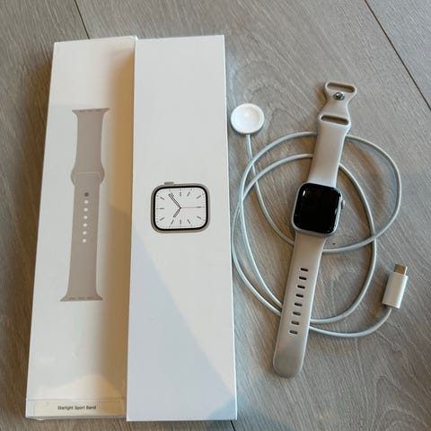 Apple Watch s10 42mm i fargen rosegull. Selges da jeg har kjøpt en annen klokke. Boksen og lader følger med. Har noen riper på siden av skjermen men alt fungerer som det skal.