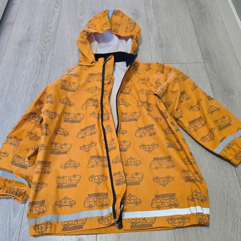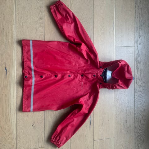 Selger en fin rød regnjakke fra kvalitetsmerket Polarn O. Pyret. Jakken er i størrelse 122/128, passer barn ca. 6–8 år. Den er godt brukt, men fortsatt i god stand og klar for nye eventyr i regnet.