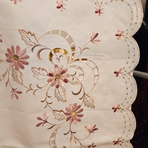 Flott brodert duk i lin i bra tilstand (størrelse 175x240cm) og 12 servietter.