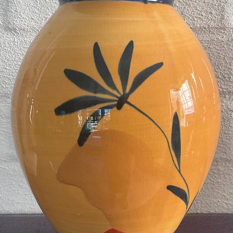 Flott keramikk krukke/vase i blått og gult. Høyde 17 cm, diameter 15 cm. Ukjent opphav men signert «Synne". I god stand.