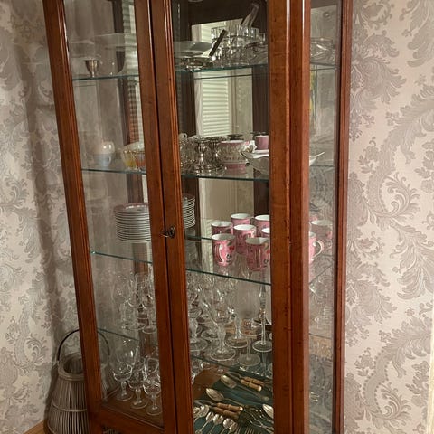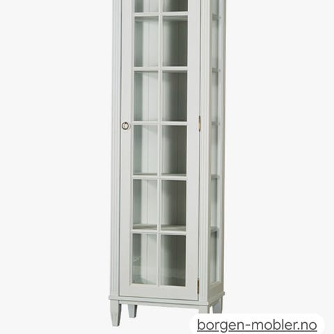 Pent brukt og massivt vitrineskap i treverk med to skuffer og glassdører. Glasshyller inne i skapet.