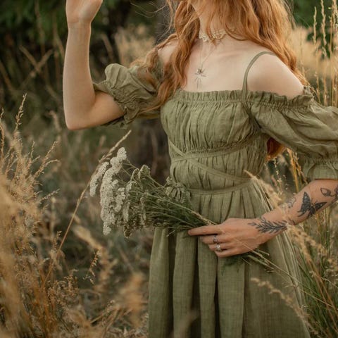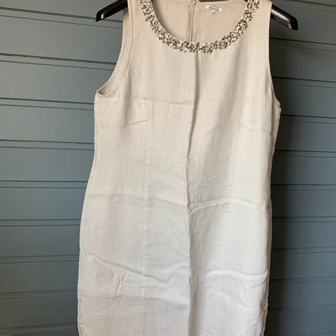 Knelang kjole fra match i 80% viskose og 20% lin. Har en «knapp» ved brystet (bild 4). Luftig og deilig å ha på. Ble aldri brukt, kun prøvd på. Elastisk midje, kan passe en M/liten L. Nypris 999 kr