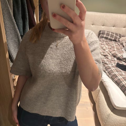 Super fin grå strikka T-skjorte selges fordi den bare blir liggende i skapet. Toppen har en fin fasong og et mykt stoff som ikke klør eller stikker! På lappen står det M, men passer fint en XS/S også. Kjøpte en størrelse større for at den ikke skulle bli så kort.