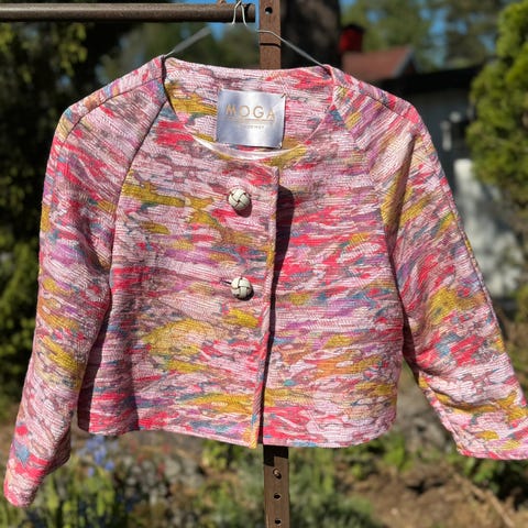Fin gråblå jakke med hette og glidelås. Fra den norske designeren Moga. En klar favoritt som jeg dessverre ikke passer lengre.
