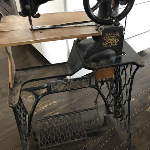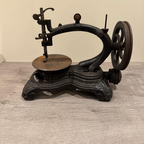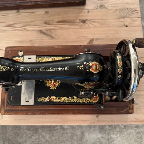 Antikke singer symaskin med dukke Et gammelt bord, en telefon og to lamper. og et gammelt strykejern Alt selges samlet Brukes til reklame Eller for samlere