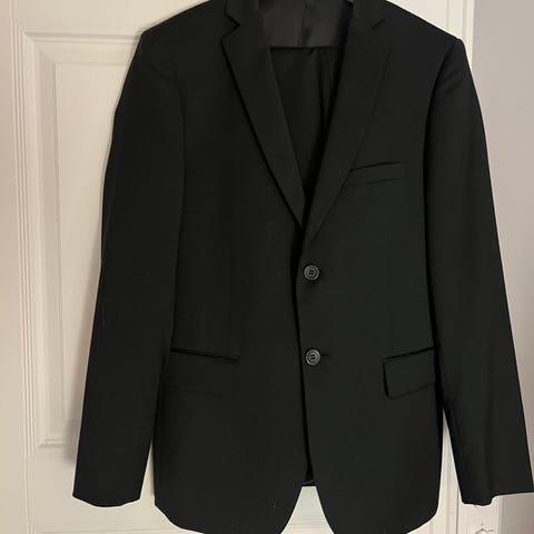 Settet består av dressjakke og bukse i samme mønster, og følger med original henger og dresspose/suit bag.