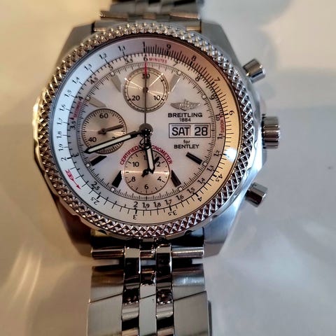 Date display between 4 and 5 o'clock position. Chronograph - three sub-dials displaying: 60 second, 60 minute and 24 hour.