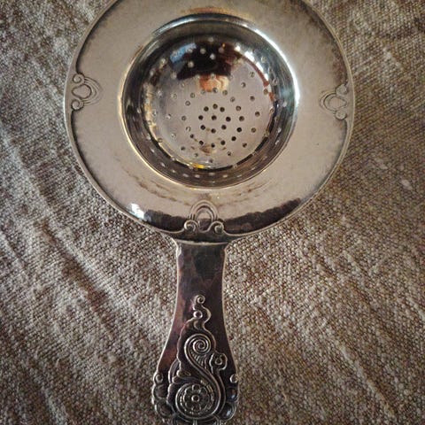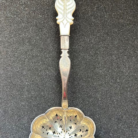 Elegant tesil i klassisk rokokkostil, laget i nysølv (ikke ekte sølv). Vakre detaljer med blomster og svungne linjer – både nyttig og dekorativ. Fin som gave til te-elsker eller som nostalgisk innslag i et serviseskap.