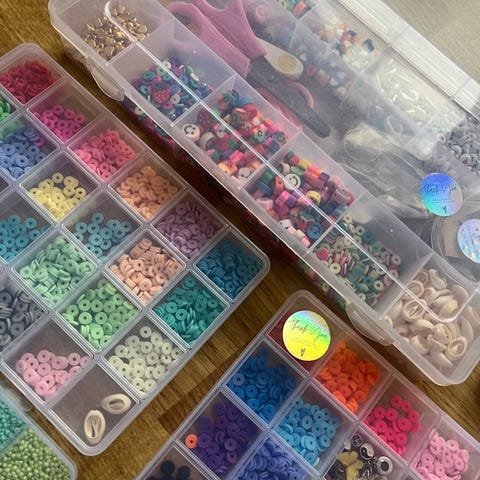 Man kan lage armbånd og ting til håret. I posen er det perler til det og små hår klyper