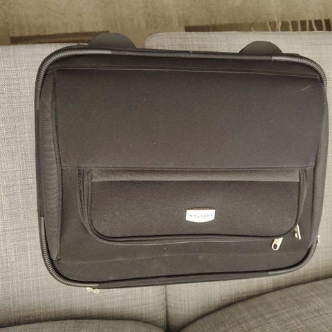 Pent brukt reiseveske, kan festes på trillekoffert håndtak. To små hvite flekker på ett hjørne se nærbilde.