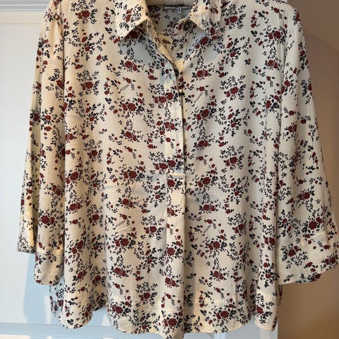 Kul bluse med peplum fra Ganni i str. 38. Blusen har nydelig blomstermønster, ballongermer og vaffelsøm over brystet. Lukkes med glidelås i ryggen. Selges fordi den er litt snau.