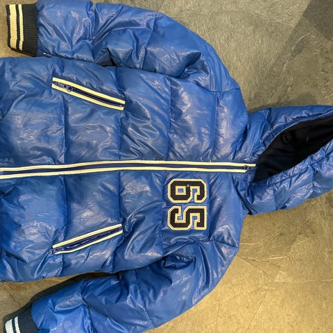 Blå og turkis jakke fra Benetton i størrelse 140 (8–9 år). Materiale: 79 % polyester, 15 % viskose og 6 % elastan. Pent brukt men har noen nupper.
