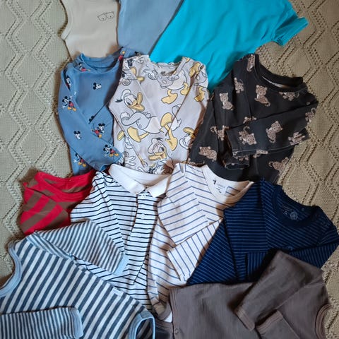 Klespakke til baby. 13 bodyer i størrelse 62. To av bodyene har flekker som ikke er forsøkt fjernet, se bilder.