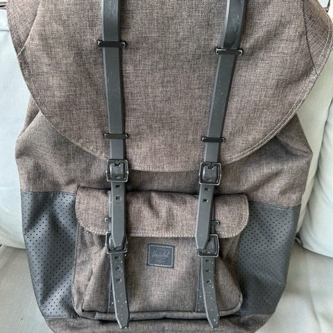 Praktisk og finn sekk selges billig grunnet slitasje på lærreimer. Tåler en del vann, men ikke vanntett.