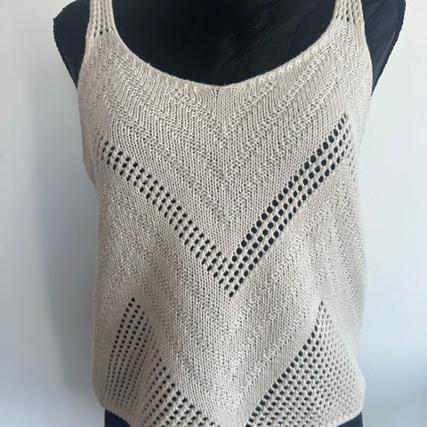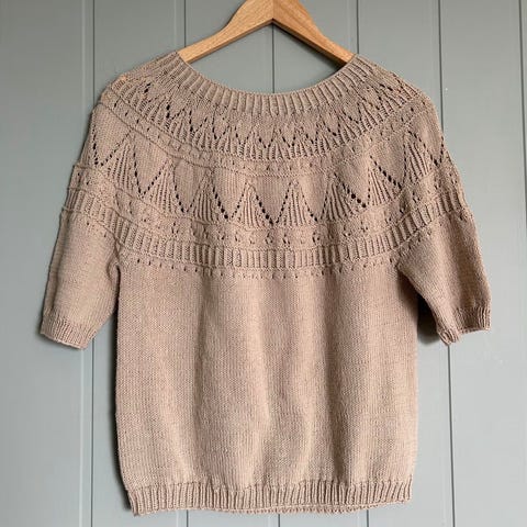 Nydelig selvstrikket dyp beige sommertopp, Lydia Lace top etter oppskrift fra Ivy&Autumn