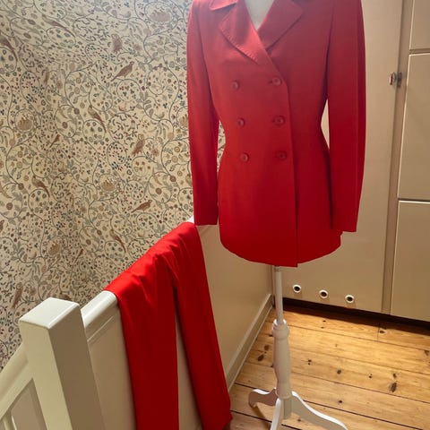 M. Costas Paris vintage orange jakke og bukse - str. 38. Polyester. Veldig tøft sett med kortermet jakke/bluse og bukse. Veldig fin stand med unntak av det øverste knappehullet som bør forsterkes/fikses. Se bilde.