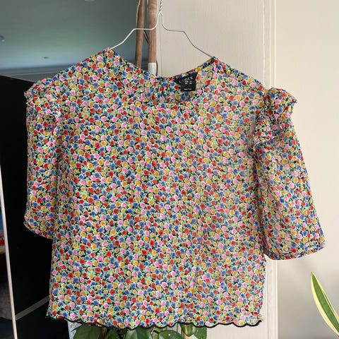 Nydelig vintagelook topp, med tynn chiffon foran, og vakkert åpen brodert rygg, holkeermer og flotte detaljer.