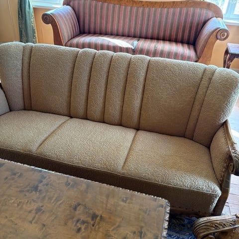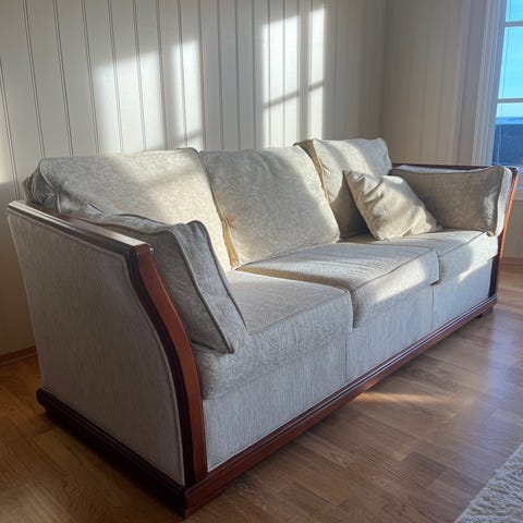 2+3 seter, tror det er Hjellegjerde, farge dus gul med treverk.