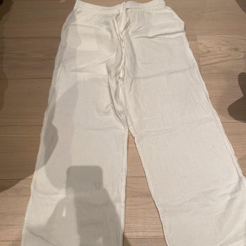 Selger en hvit linbukse i rett vid modell i str.44. Buksen rekker til litt over anklene. Har brukt den en gang og vasket en gang. Laget av 52% lin og 48% viskose. Buksen har strikk og snøring i livet og to stikklommer i front. Kostet 1000kr ny.
